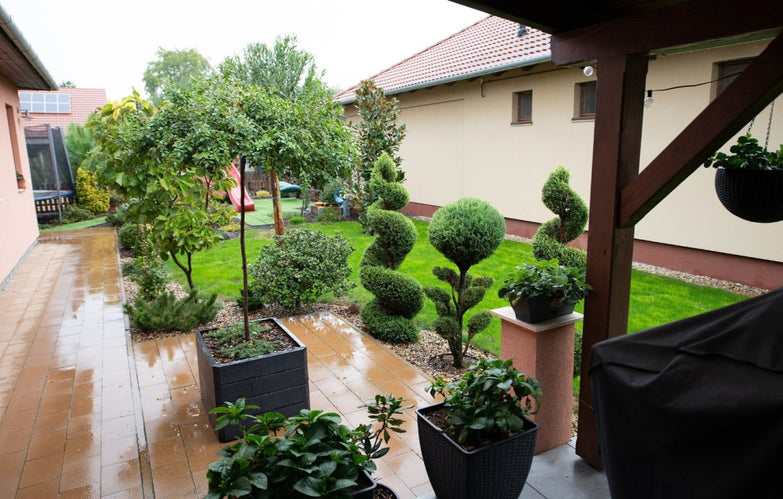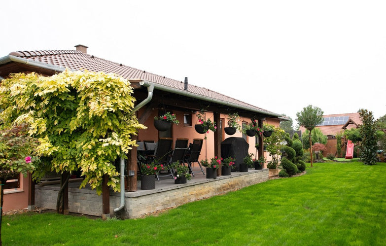 Az automata öntözőrendszert a telken található fúrt kút táplálja, a kert ápolásához szükséges eszközök egy külön kialakított szerszámtárolóban kaptak helyet. Az egész ház, beleértve az utcafrontos is – igényesen parkosított.