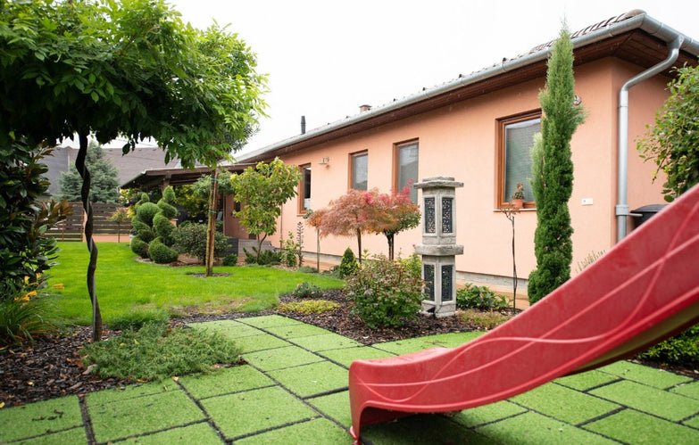 Gyermekek időtöltésére kiválóan alkalmas a zöld területen kialakított kis játszótér – hinták, homokozó, csúszdás kicsi favár, kosárpalánk, de akár természetesen a focihoz, és bármilyen egyéb szabadidős tevékenységhez is tökéletes a 900 négyzetméteres telekméret, és az egész ingatlanra jellemző nagyfokú igényesség. Otthoni zöldség termesztéshez pici üvegház is rendelkezésre áll, illetve termő fák biztosítják a mindennapi háztáji gyümölcsöt.
