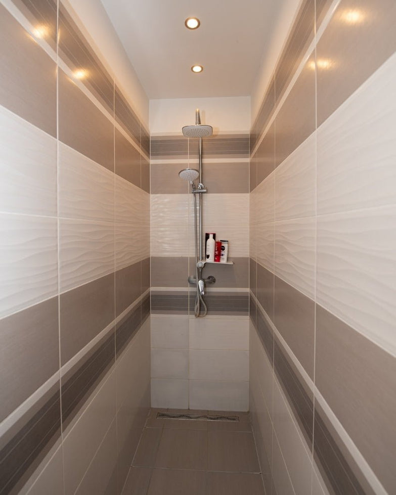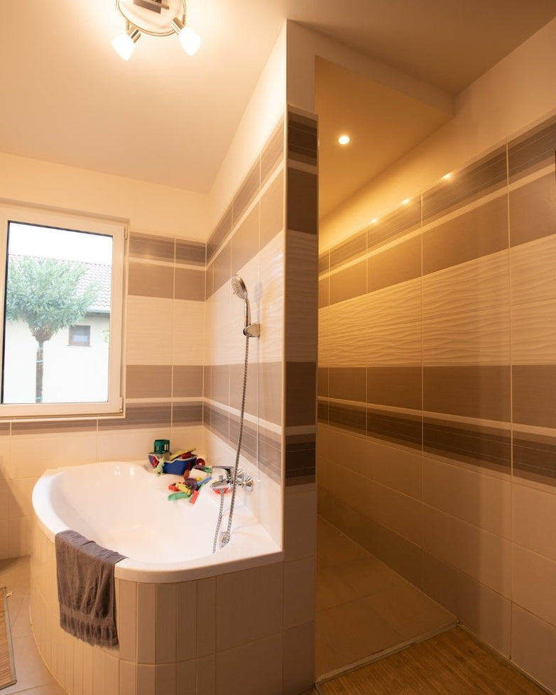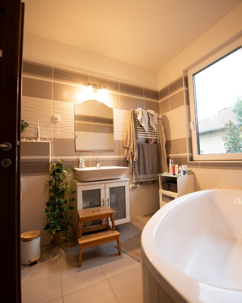 A világos, jól megvilágított fürdőszobában dupla mosdókagyló és sarokkád található, illetve külön kialakításra került a fürdő mellett egy önálló zuhanyzó is. A háztartási helységben lettek elhelyezve az ide tartozó gépészeti eszközök; gázkazán, a mosógép, szárítógép is, ezzel sem zavarva a fürdőszoba szuverenitását.