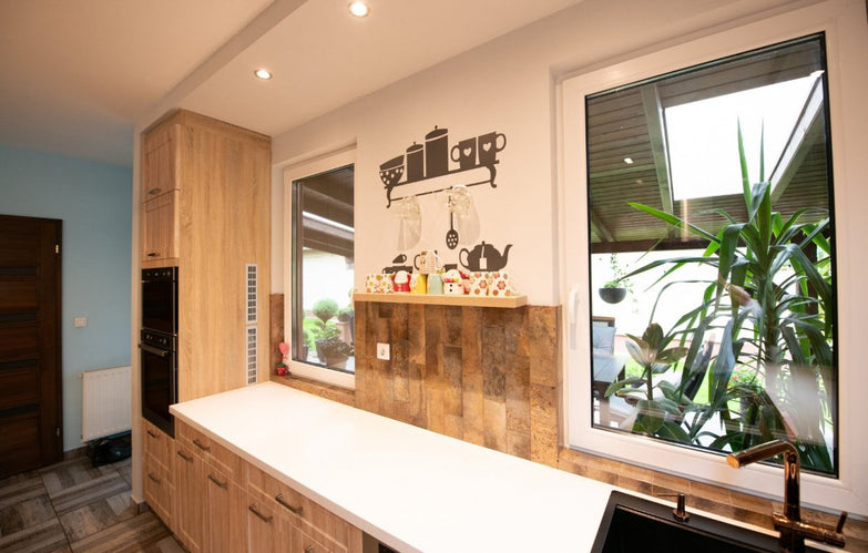 A modern gépészetű, kamrával is ellátott konyhából is csodálatos a gondozott és ápolt parkosított kert, formára vágott egzotikus növények, vakondhálóval is ellátott füves zöldterület látványa.