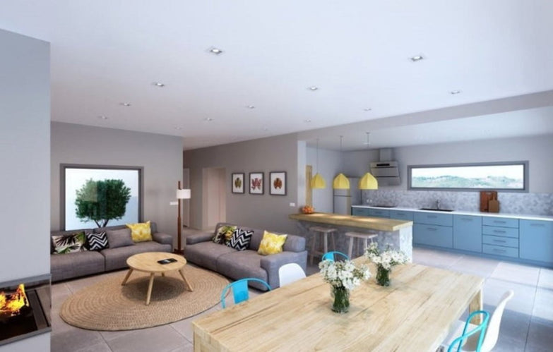 A ház tágas nappalit, két hálószobát, fürdőt és kamrát kínál, valamint 17 m²-es garázs biztosítja a kényelmes tárolást. A hőszivattyús fűtés és a padlófűtés biztosítja az energia-hatékony, kényelmes életet. A gondosan megtervezett alaprajz és a modern kivitelezés biztosítja, hogy az új otthon minden négyzetmétere funkcionális és kényelmes legyen.