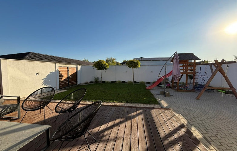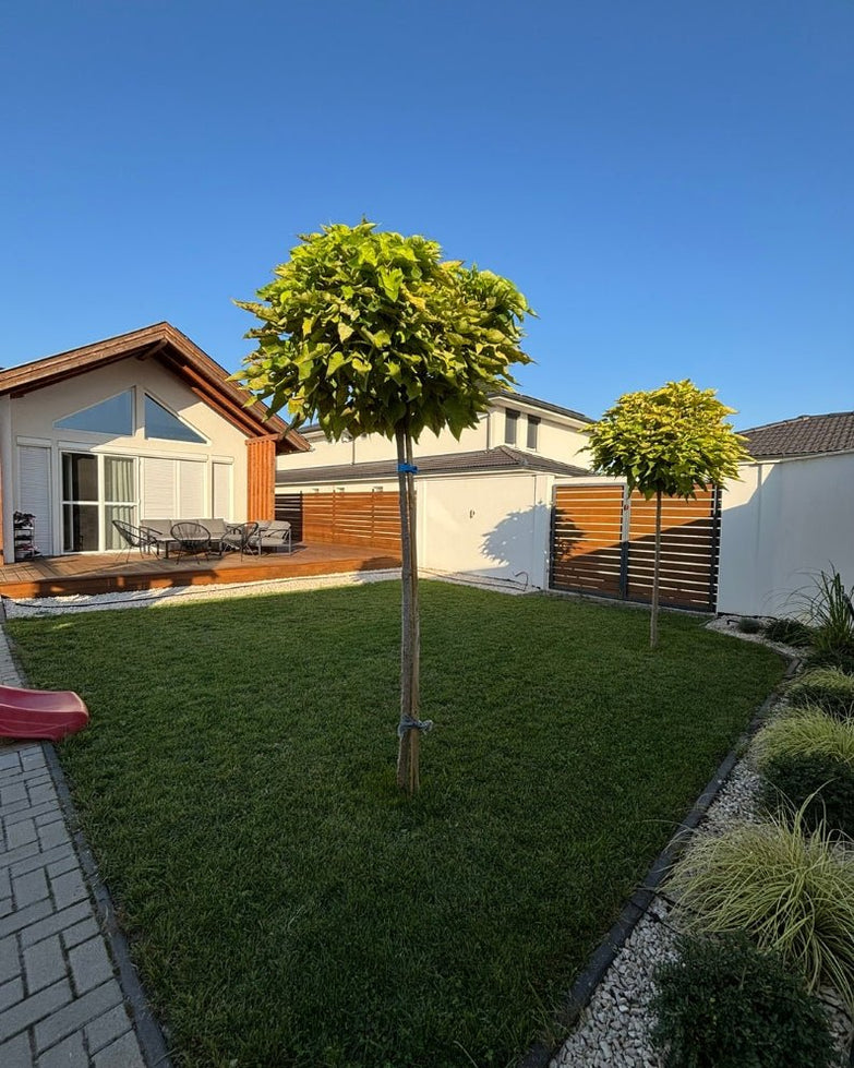 Képzelje el, hogy reggelente egy, parkosított kertre ébred, ahol minden növény gondosan ápolt, az öntözőrendszer gyönyörű és automatikusan biztosítja a megfelelő vízellátást. A terasz alatt egy fúrt kút rejtőzik, amely szinte észrevéve látja el a kertet mindig, így a növények frissen zöldellnek. Az előkertben 4-8 autó kényelmesen elfér a térkövezett parkolóhelyeken, így nem csak Önnek, de vendégeinek is elegendő helyet biztosít.