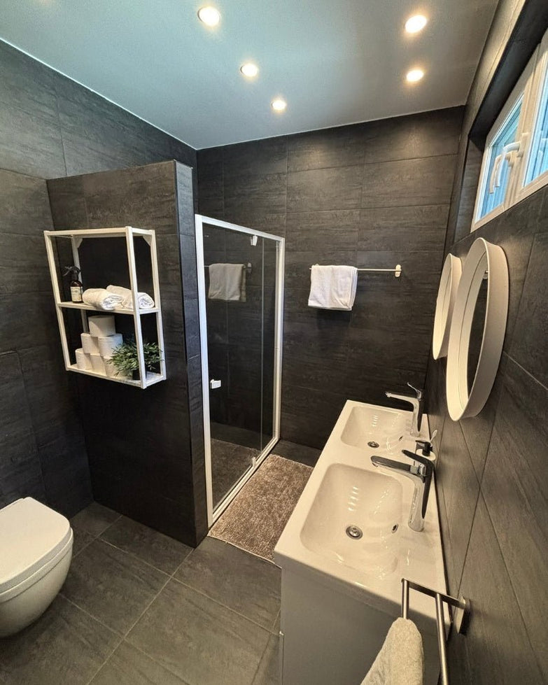 Az ingatlan minden részlete a kényelem és a biztonság szolgálatában áll. Az elektromos, alumínium redőnyök nemcsak a nyári meleg ellen védenek, hanem fokozzák a hőszigetelést is, és biztosítják a privát szférát. A hálószobában inverteres klímák gondoskodnak a kívánt hőmérsékletről, a légszűrők pedig megszűrik a port és a pollent, hogy Ön mindig tiszta, friss levegőben pihenhessen.
