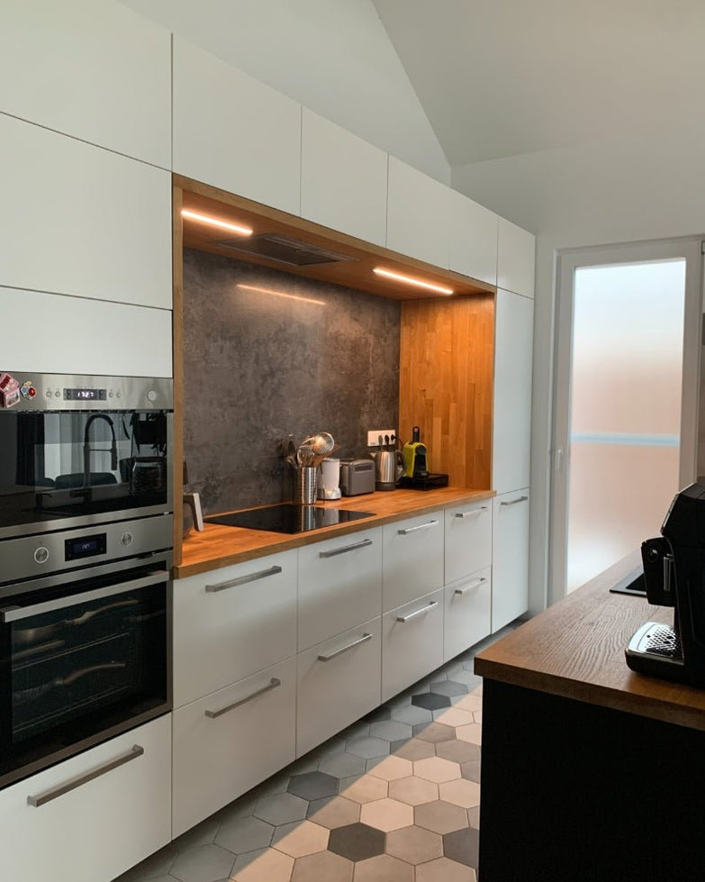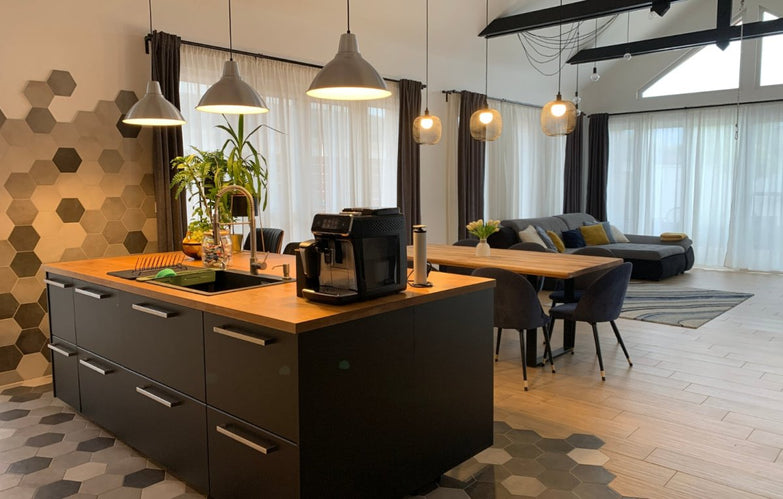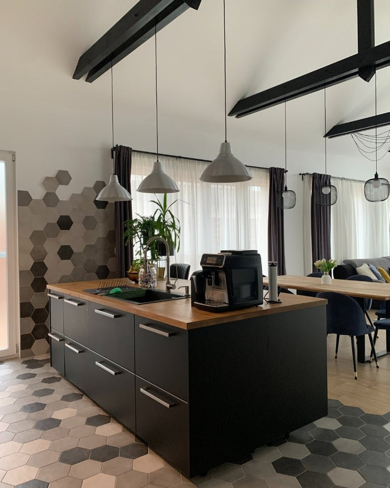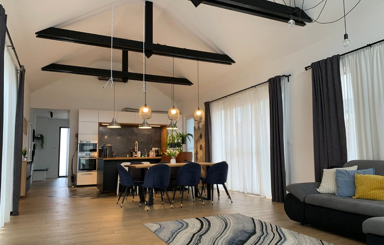 Ahogy belép a házba, egy tágas, világos nappali-konyha-étkező tér fogadja, amely az emelt belmagasság és a látszó fa tartószerkezet miatt különleges, egyedi atmoszférát áraszt. A napfény szinte árad a nagy üvegfelületeken keresztül, melegséget hozva a belső terekbe, mindig be a modern kialakítás és a természetes elemek harmonikus együttes teremt otthonos légkört.