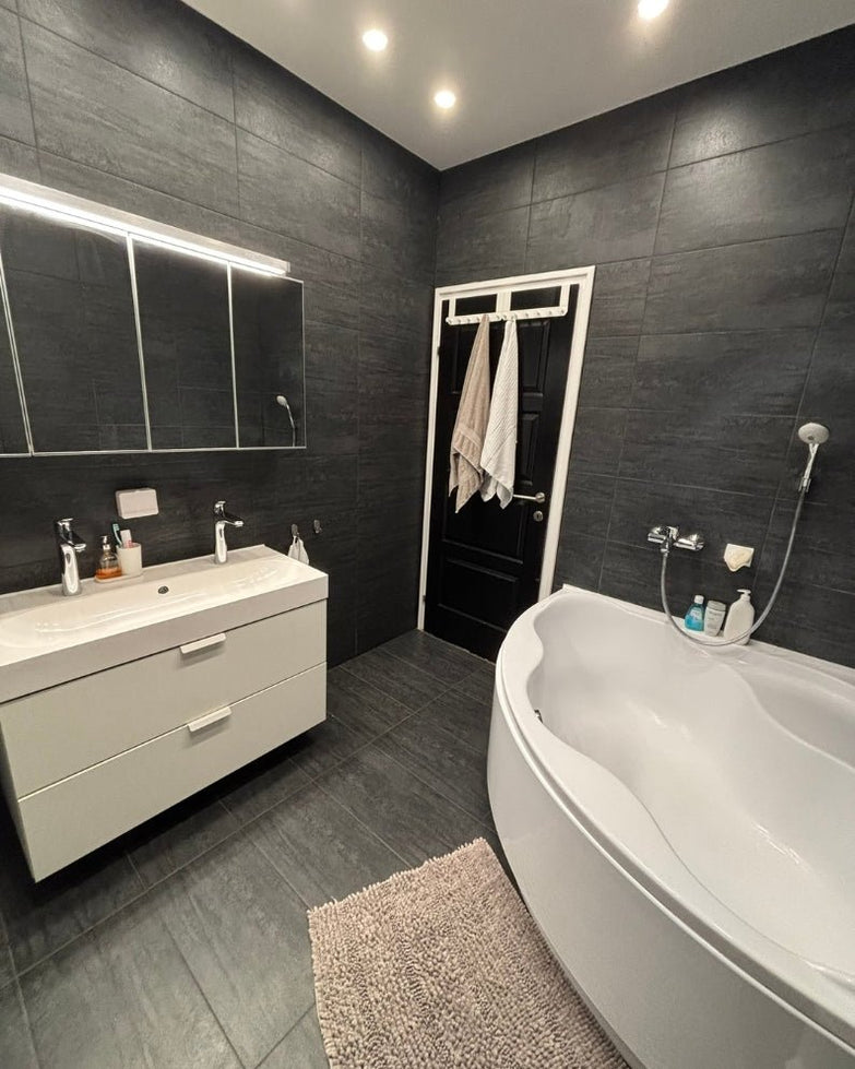 A ház minden részletében ott van a fenntarthatóság és az energiatakarékosság gondolata. A mennyezetbe épített 40 cm vastag kőzetgyapot, a 15 cm-es homlokzati és a 12 cm-es aljzatszigetelés gondoskodik arról, hogy a hőszigetelés mindig optimális legyen. A padlófűtés egész házban – sőt, a garázsban is – egyenletes hőérzetet biztosít, csak az alacsony havi fűtési költséget, mindössze 14.000 forint.