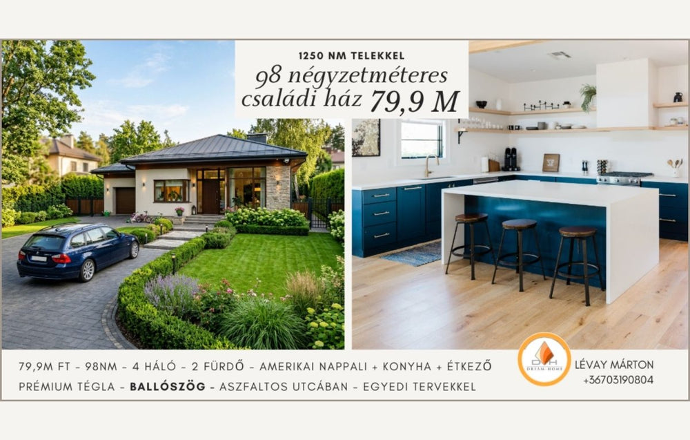 Új építésű, prémium műszaki tartalmú, téglaépítésű családi ház eladó Ballószögön, egy 1100 m²-es, kivételes méretű összközműves telken, rendezett, aszfaltos utcában. A tágas telek ideális azoknak, akik értékelik a kényelmet, a szabadságot és a hosszú távú lehetőségeket – legyen szó kertépítésről, játszótérről vagy akár további fejlesztésekről.